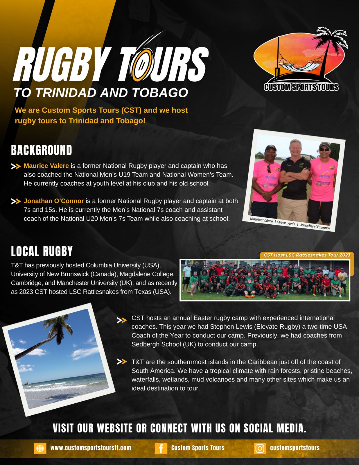 I am the Head Coach of the Lonestar Rattlesnakes U23 program that toured Trinidad in Summer 2023. What a great experience we had … They facilitated 2 great games for us over the space of a week. Our schedule consisted of arriving on a Sunday, staying at a hotel within walking distance to the rugby training facilities. We prepared both Monday and Tuesday, playing on Wednesday. They arranged one of the local clubs to host an after-match function where they provided local beers and food, plus great stories and hospitality. Thursday was a sightseeing day that was set up by our hosts where a bus took us to an isolated beach for a recovery session, relaxation, and some local food once again. Friday, we got back into game preparation ready for Saturday. Saturday, we played midafternoon, once again was hosted by a different club, and had a great time appreciating our last night on the island.” – Darren Scott, Head Coach of LSC Rattlesnakes